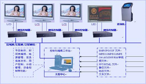 广告多媒体控制播放系统由主控中心、网络控制器、网络平台和显示设备(如液晶电视)组成。