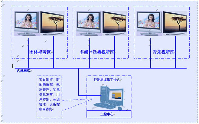 图书馆视听资料播放系统由控制中心主机、网络控制器、网络平台和显示设备(如大屏幕电视)组成。