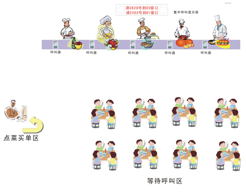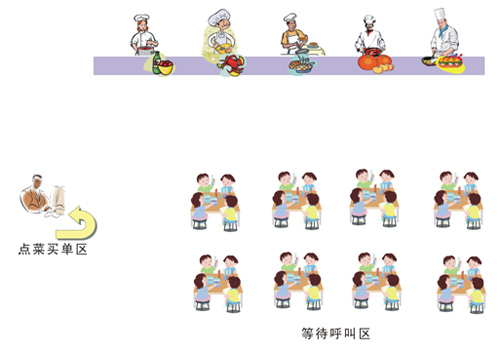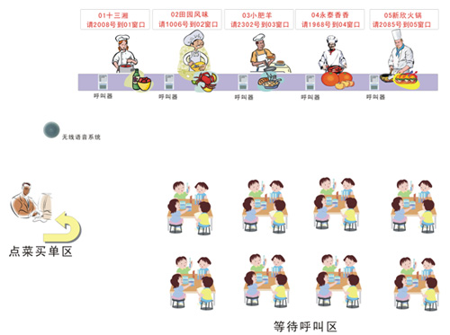 美食城这样的场所。有很多个摊位,一个收费处。顾客到付款机前点好菜,买单,拿着小票等待呼叫,听到呼叫后走到柜台取餐就可以了。如下图所示: | |||||||||||||||||||||||||||