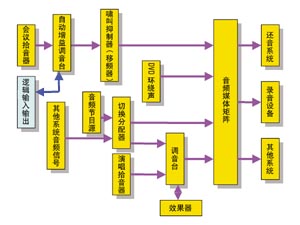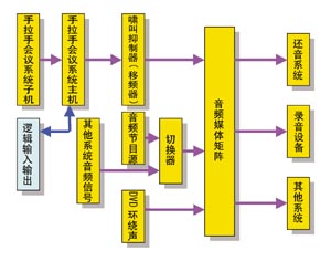 此外,目前市场上还有大量的手拉手式会议系统,它们也得到了广泛的应用。不过笔者认为,我们上面所述的系统与其并不矛盾,这些手拉手式系统一方面可以独立完成某些会议功能,另外也可以作为一个部分参与到我们上述系统中去,主要用以替代拾音器、自动调音台以及部分还音系统。当然,任何系统都不能依照一成不变的教条,而应根据实际情况予以灵活调整。下图1即为上述音频系统的基本原理框图,根据所选用产品以及功能的不同,系统也可以在此基础上有所变化,如图2和图3所示,这里我们就不再一一列举了。