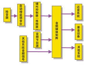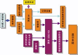 对于相关信号调度问题,会议系统中主要通过视频切换矩阵、VGA(RGB)切换矩阵以及相应分配器来实现。其中视频矩阵主要负责摄像机、录像机、DVD机以及视频展示台等设备输出的视频信号的切换调度,而VGA(RGB)矩阵则主要负责计算机、电子白板等信号的切换调度。如果本系统中摄录像部分要求比较高,那么还需要配备视频制作特技台或编辑机来进行信号的复杂处理,如叠画等特技制作以及节目编辑等等。在一个正常的会议系统中,视频信号主要包括录像机信号、DVD(VCD)机信号、视频展示台信号、摄像机信号(或特技台及编辑机的输出信号)以及电视会议远端传送过来的信号等,它们全部送入视频矩阵,然后根据需要分别送入不同的显示设备进行显示。而有关计算机、电子白板的信号以及外来的其他VGA(或RGB)信号则需要送入VGA(或RGB)矩阵,由其切换分配后同样送入显示终端向与会者进行显示。在此,有必要注意一点,那就是如果VGA信号源与相应矩阵及显示终端设备的距离较远,势必会造成VGA信号的传输衰减,这个问题可以通过使用信号转换放大器,将VGA信号转换成RGB信号并进行放大后传输的手段在一定程度上予以解决。此外,笔者还注意到,在目前的某些会议系统中,视频信号的输出(可能直接取自节目源设备、也可能取自视频矩阵输出之后)首先经过一个VGA或RGB转换器,而后再送入VGA(或RGB)矩阵进行切换处理,据说这样做的目的一方面可以提高画质;另一方面是为了满足某些不具备视频接口的显示设备的输入需要。但是依据笔者多年的工作经验,这样做对于画质的提高非常有限,而且某些低档的转换器甚至还会有损于画质,同时由于目前的显示终端设备大都同时具有视频及VGA/RGB接口,因此,除非确有必要,否则这种做法就大可不必了。此外,如果本会议系统中还有远程电视会议、同声传译以及卡拉OK等功能的需要,那么在信号调度上,通过矩阵还需将有关信号分别输出至电视会议编码设备、同传室的监控器材以及卡拉OK演唱者的监视器上。