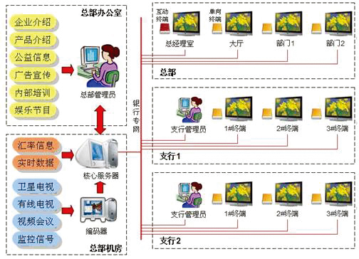 除了架构的不同,多媒体信息发布系统随着技术的发展,分为基于PC机的、基于机顶盒的和基于专业化播放器的的系统。基于PC机的系统是通过利用银行目前的PC系统,在服务器上安装多媒体信息发布系统实现信息的集中管理和控制,通过PC的显卡连接屏幕传送视频内容。基于机顶盒的系统是采用VOD服务器+机顶盒宽带网络系统,通过VOD的视频交互作用实现视频内容宽带传送。基于专业化播放器的系统,采用嵌入式UNIX系统的播放器传送各种格式的视频内容。具体应用如下:银行可以在分布各地的营业厅装设大屏幕显示终端,通过网络连接到中心服务器;管理人员只需要在办公室,登陆管理平台,就可以完成信息的制作和发布,以及整个系统的监控及管理。通过信息发布系统,管理人员能够决定“在什么时间”,“位于什么地点的显示终端”,“以什么样的方式”,“显示什么样的内容”。以下列举了多媒体信息发布系统在银行应用的主要功能:
