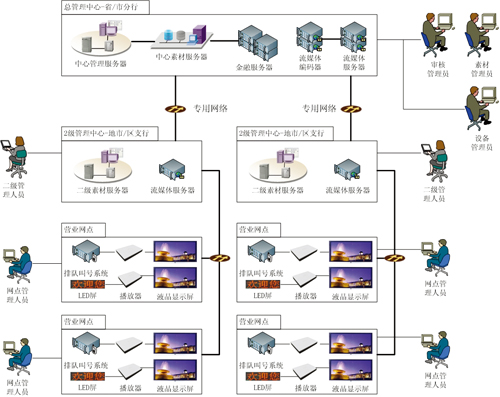 1)省分行的总管理中心:总管理中心包括管理服务器、中心素材服务器、流媒体编码器/服务器等,可以为整个系统提供管理功能和素材、流媒体传输功能。考虑到尽量少的占用银行专网带宽,所以总管理中心提供的素材分发一般只包括低速的文本和图片信息,以及单播方式的流媒体,其他素材的分发功能下移到2级管理中心;
