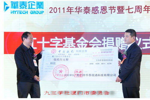 “辉煌七年 感谢有你”感恩庆典晚会随后登场,华泰企业重要合作伙伴授牌仪式、华泰企业标识启动仪式、华泰企业向厦门市红十字基金会捐献人民币50万元等环节好戏迭出,不仅标志着企业软硬实力的齐头并进,更显示企业强烈的社会责任心和回馈社会的感恩之情。