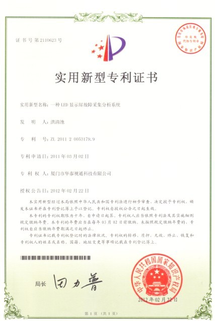 庆公司荣获《一种LED显示屏故障采集分析系统》实用新型专利证书