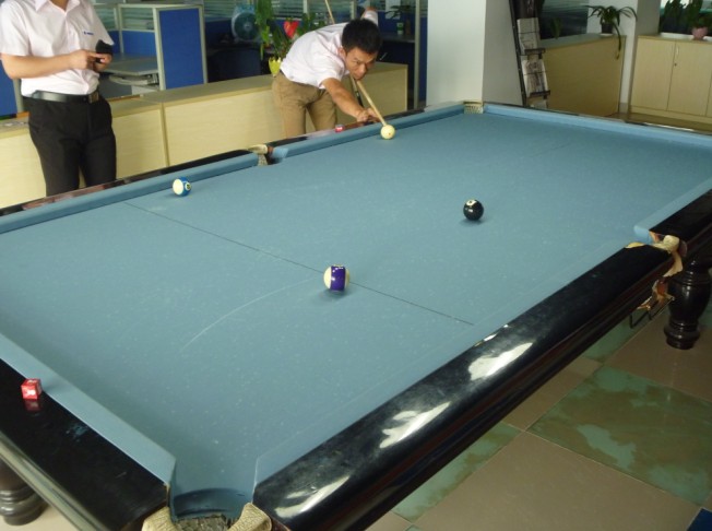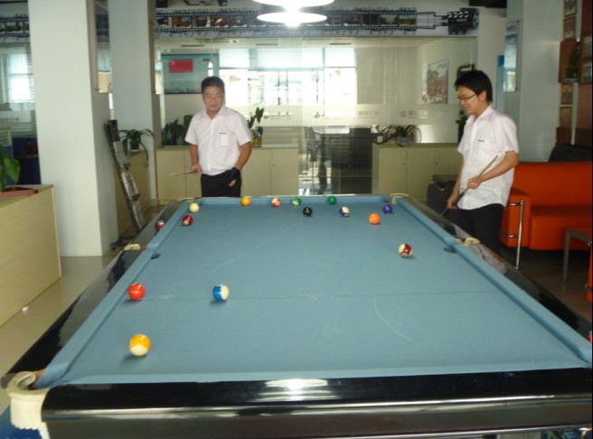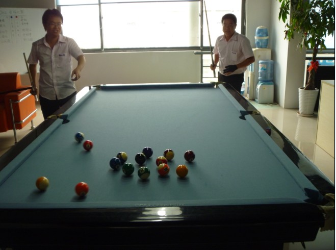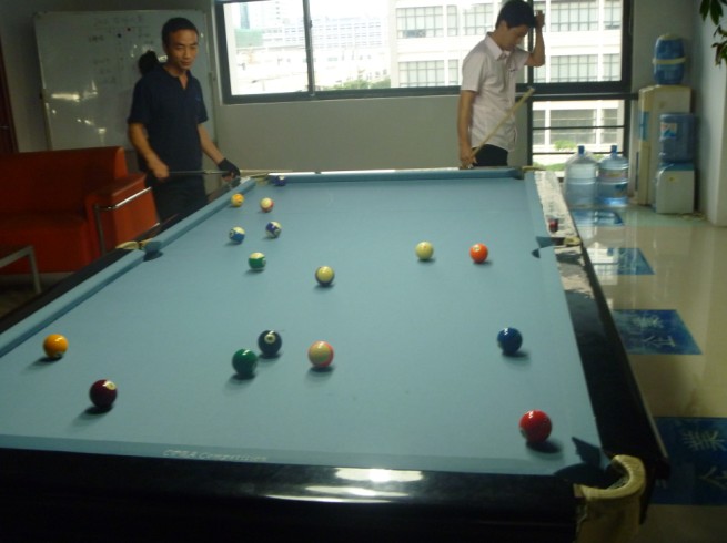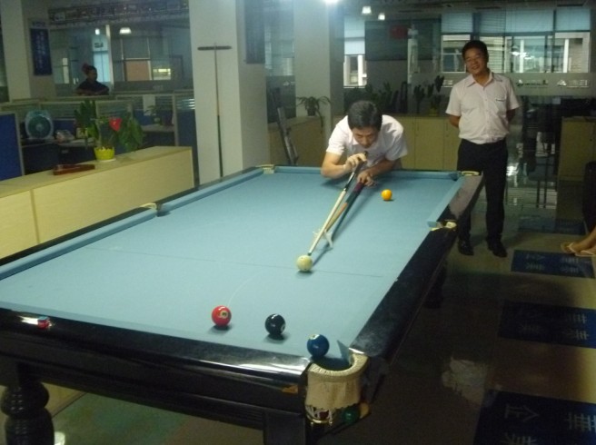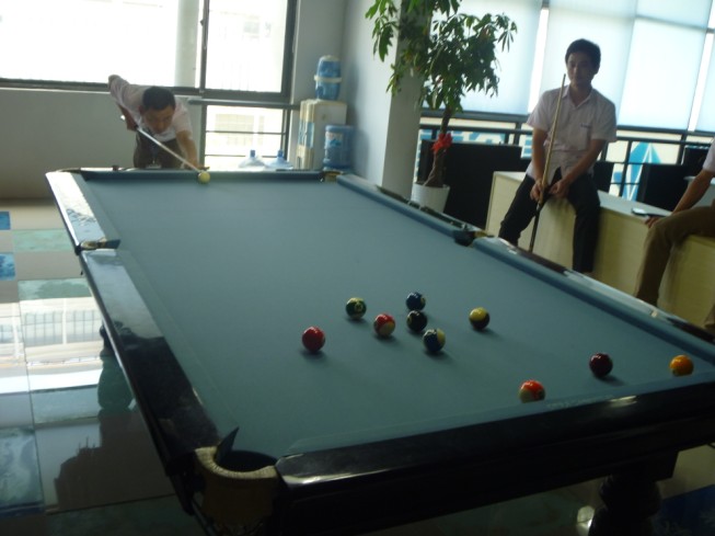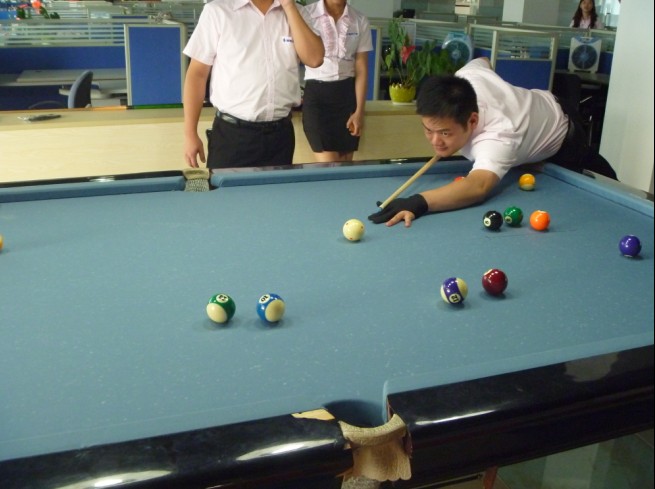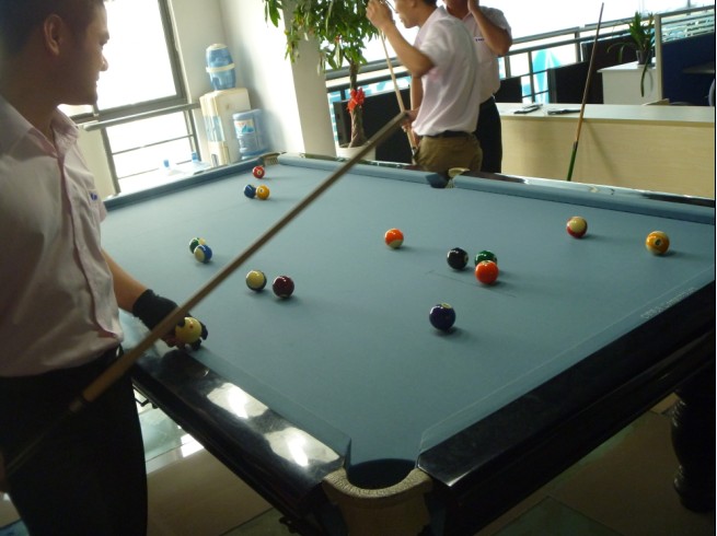 公司在六月组织台球比赛,报名的同事超过十个,我们就将他们分为五小组进行比赛,战况激烈。