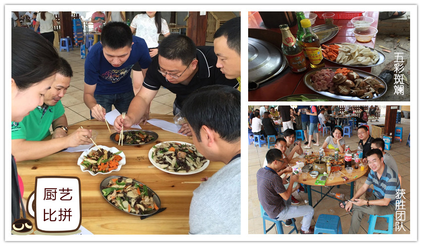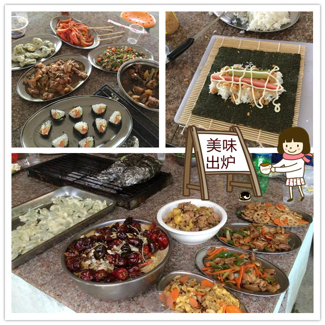 大家分成4组,分工合作,有的砍柴生火,有的洗菜切菜,有的剁馅包饺子,有的主厨担当……每桌精心合作烹饪出一道道私房料理格外美味。美食出炉,奥尔良烤鸡、黄金土豆排骨、青椒回锅肉、客家酿豆腐、香香藕夹、韭菜猪肉饺、鱼头豆腐汤……款款美味,款款经典呀!