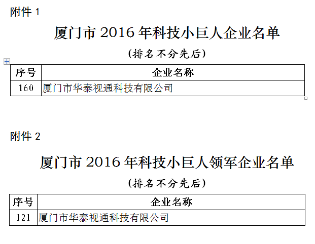 近日,厦门市科技局、财政局、发改委、经信局和火炬管委会五部门联合公布了2016年厦门市科技小巨人企业和领军企业名单。厦门市华泰视通科技有限公司等175家企业被认定为“厦门市科技小巨人领军企业”。