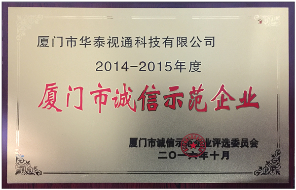 为贯彻党的十八大全会精神,促进形成我市诚信建设的社会环境,建设“美丽厦门”,2016年12月7日(星期三)下午在金雁酒店召开了“2014-2015年度厦门市诚信示范企业”表彰大会,包括厦门市华泰视通科技有限公司在内的412家诚信示范企业获授牌。